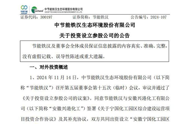 中节能铁汉生态环境股份有限公司(简称:节能铁汉)近日公告称,公司与安徽兴港化工有限公司(以下简称“安徽兴港化工”)签署了《关于宁国化工园区综合建设运营项目投资合作协议》及其补充协议,双方共同出资设立“安徽宁国化工园区投资建设有限公司”(暂定名,具体以工商核准登记为准,以下简称&ldquo...