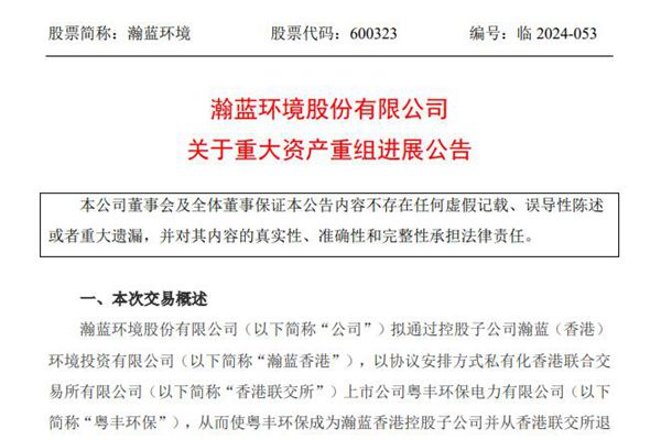 瀚蓝环境股份有限公司(简称:瀚蓝环境)近期再次披露《关于重大资产重组进展公告》。据该公告,瀚蓝环境正积极开展对粤丰环保电力有限公司(下称“粤丰环保”)的审计和估值等相关工作,目前进展顺利。 瀚蓝环境将在相关工作完成后,再次召开董事会审议本次交易的相关事项,并由董事会召集股东大会审议与本次交易相关的议案。本次交...