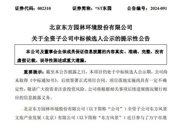 北京东方园林环境股份有限公司(简称:*ST东园,即“东方园林”)近日公告称,公司全资子公司东方风景文旅产业发展(北京)有限公司(以下简称“东方风景”)作为牵头人,与万宁市城市投资建设有限公司、中传投资有限责任公司组成的联合体成为万宁市港北区域生态环境治理及海洋新经济示范区 EOD 项目中...