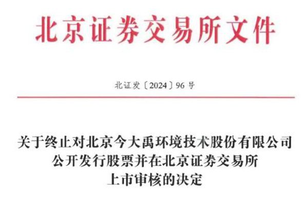 北交所网站近日披露关于终止对北京今大禹环境技术股份有限公司(简称“今大禹”)公开发行股票并在北京证券交易所上市审核的决定。 据悉,9月25日,今大禹向北交所提交了《关于北京今大禹环境技术股份有限公司撤回向不特定合格投资者公开发行股票并在北京证券交易所上市申请文件的申请报告》,申请撤回申请文件。根据《北京证券交...