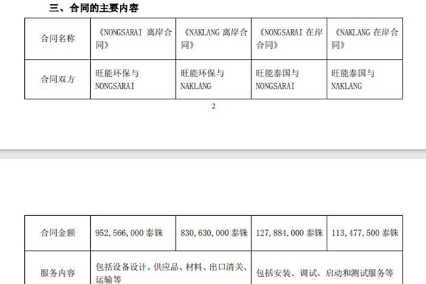 2024年9月28日,旺能环境股份有限公司发布《 关于子公司签订泰国项目合同的公告》。图源:旺能环境公告 即,旺能环境全资子公司浙江旺能环保有限公司分别与 SIAM POWER NONGSARAI COMPANY LIMITED、SIAM POWER NAKLANG COMPANY LIMITED签署了《呵叻府 NONGSARAI ...
