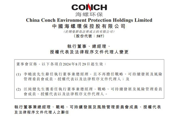 2024年8月29日,中国海螺环保控股有限公司发布《执行董事、总经理、授权代表及法律程序文件代理人变更》公告。图源:海螺环保公告 公告称,李晓波辞任执行董事兼总经理,且不再担任战略、可持续发展及风险管理委员会成员、授权代表以及法律程序文件代理人。同时,汪纯健获委任执行董事兼总经理,战略、可持续发展及风险管理委员会成员、授权代表以及法...