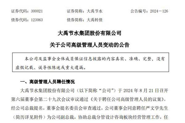 大禹节水集团股份有限公司(简称:大禹节水)近日发布《关于公司高级管理人员变动的公告》,经第六届董事会第二十九次会议审议通过,公司董事会同意聘任严文学先生为公司副总裁,协助总裁分管设计咨询板块经营管理工作,任期自董事会审议通过之日起至第六届董事会任期届满之日为止。 严文学先生直接持有公司股票 102,500 股,与持有公司 5%以上股...