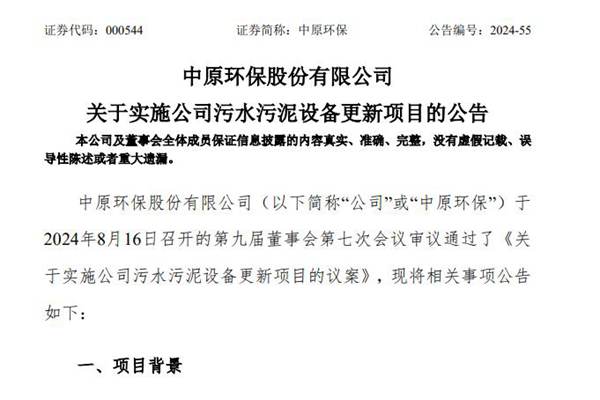 中原环保股份有限公司(简称:中原环保)公告称,将结合公司下属污水处理厂、污泥处理厂、再生水利用等设施设备实际情况,有序推进生产运营单位老旧设备更新,实施公司污水污泥设备更新项目。本次设备更新分为三个项目实施,具体为:中原环保股份有限公司污水污泥处理设备更新项目、郑州市主城区污水处理厂设备更新项目、郑州市污水净化有限公司污水污泥处理设备...