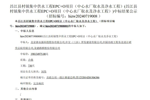 2024年8月16日,昌江县村镇集中供水工程EPC+O项目(中心水厂取水及净水工程)中标结果公示。 中标人:北京碧水源科技股份有限公司,中交(三沙)开发建设有限公司,中国市政工程东北设计研究总院有限公司,龙建路桥股份有限公司,中标价190134975.00元。图源:海南省公共资源交易平台 紧接着,8月19日,昌江县村镇集中供水工程...