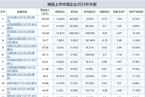 根据不完全统计,港股截至目前共有33家环境企业披露2023年度业绩报告,其中20家营收下滑,22家净利润下滑,11家企业亏损。 营收规模位居一二的依然是行业头部企业光大环境和北控水务。其中,光大环境2023全年创造营收320.9亿港元,净利润44.29亿元。北控水务年营收245亿元(人民币,下同),同比增长14%,公司股东应占溢利1...
