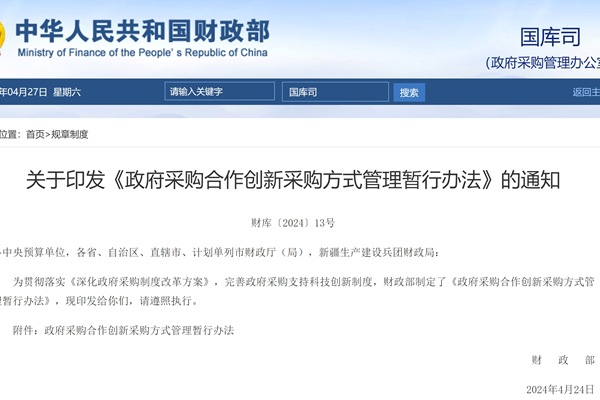 关于印发《政府采购合作创新采购方式管理暂行办法》的通知财库〔2024〕13号 各中央预算单位,各省、自治区、直辖市、计划单列市财政厅(局),新疆生产建设兵团财政局: 为贯彻落实《深化政府采购制度改革方案》,完善政府采购支持科技创新制度,财政部制定了《政府采购合作创新采购方式管理暂行办法》,现印发给你们,请遵照执行。 附件:政府采购合...