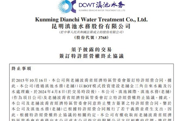 2024年4月8日,滇池水务、滇池国际、滇池水务(老挝)(作为项目公司)及老挝波乔省经济特区管委会订立特许经营权终止协议。滇池水务及老挝波乔省经济特区管委会同意终止双方签署的特许经营合同(以BOT模式投资建设老挝金三角自来水厂及污水处理厂)。 鉴于公司及滇池水务(老挝)已根据特许经营合同履行了若干义务并产生支出,因此,根据特许经营权...
