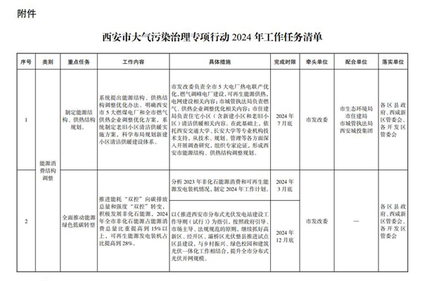 西安市人民政府办公厅关于印发大气污染治理专项行动2024年工作方案的通知 各区、县人民政府,市人民政府各工作部门、各直属机构: 《西安市大气污染治理专项行动2024年工作方案》已经市政府同意,现印发给你们,请认真贯彻执行。 西安市人民政府办公厅 2024年3月29日 (此件公开发布)西安市大气污染治理专项行动2024年工作方案 ...