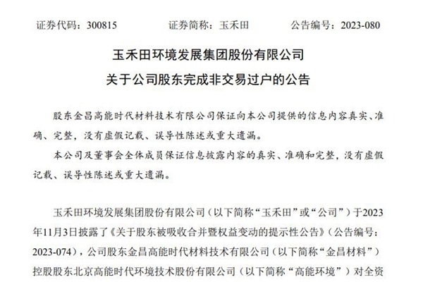 11月25日,玉禾田环境发展集团股份有限公司(简称:玉禾田)发布《关于公司股东完成非交易过户的公告》。公告显示,玉禾田股东金昌高能时代材料技术有限公司(以下简称“金昌材料”)的控股股东北京高能时代环境技术股份有限公司(以下简称“高能环境”)正在对全资子公司进行整合,金昌材料将被高能环境全...