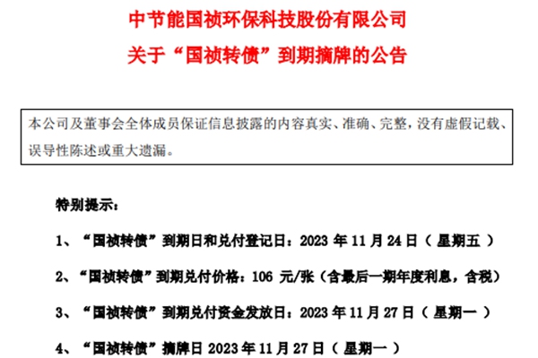 1、“国祯转债”到期日和兑付登记日:2023 年 11 月 24 日( 星期五 ) 2、“国祯转债”到期兑付价格:106 元/张(含最后一期年度利息,含税) 3、“国祯转债”到期兑付资金发放日:2023 年 11 月 27 日( 星期一 ) 4、&ldquo...