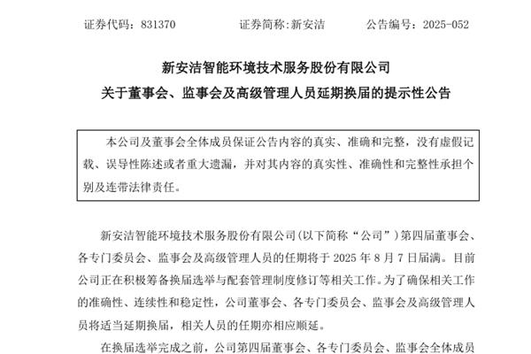 新安洁智能环境技术服务股份有限公司(简称:新安洁)近日公告称,公司第四届董事会、各专门委员会、监事会及高级管理人员的任期将于2025年8月7日届满,目前公司正在积极筹备换届选举与配套管理制度修订等相关工作。为了确保相关工作的准确性、连续性和稳定性,公司董事会、各专门委员会、监事会及高级管理人员将适当延期换届,相关人员的任期亦相应顺延。...