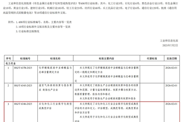 近日,由中国工业互联网研究院(以下简称“工联院”)牵头研制的《石化和化工行业数字化转型成熟度评估》(HG/T 6346-2025)行业标准正式发布,将于2026年2月正式实施。 石化和化工行业是国民经济的重要支柱产业,是典型的流程制造,产品种类多、工艺流程长、物料物性杂、工况苛刻,且多涉及重点监管的危险化工工...