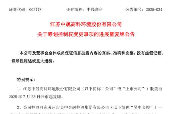 近日,江苏中晟高科环境股份有限公司(简称:中晟高科)发布公告称,公司控股股东苏州市吴中金融控股集团有限公司(下称“吴中金控”)一致行动人苏州吴中区天凯汇达股权投资合伙企业(有限合伙)(下称“天凯汇达”)于7月22日与福州千景投资有限公司(下称“福州千景”)签署了《...
