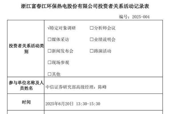2025年06月23日,浙江富春江环保热电股份有限公司发布《投资者关系活动记录表》。 1、公司热电联产业务的发展与优化? 公司热电联产业务板块已建成投运的总生产规模为三十四炉二十二机,总装机容量340兆瓦,锅炉蒸发量4,240吨/小时,且尚有2个热电联产扩建项目,预计投产后增加装机容量43兆瓦,锅炉蒸发量360吨/小时。公司积极探...