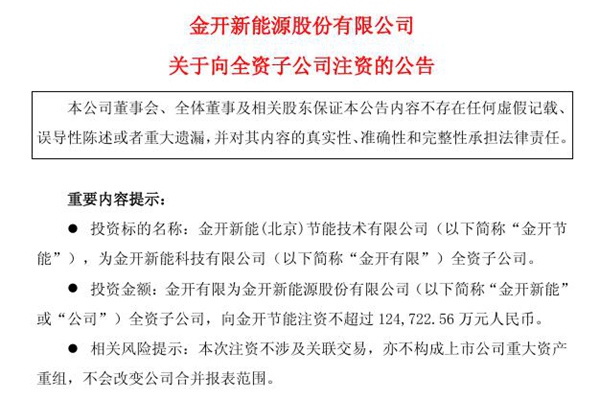 2025年06月24日,金开新能源股份有限公司发布《关于向全资子公司注资的公告》。图源:金开新能公告 金开新能全资子公司金开新能科技有限公司使用自有资金对其全资子公司金开新能(北京)节能技术有限公司注资不超过124,722.56 万元人民币。 本次注资是基于公司战略布局以及子公司经营发展的需要,为其项目推进提供必要的保障,公司拟通...
