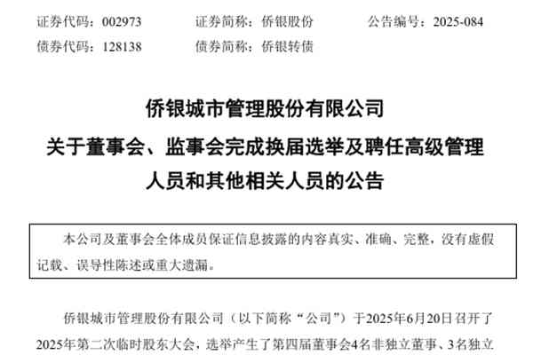 侨银城市管理股份有限公司(简称:侨银股份)近日公告称,公司董事会、监事会换届选举已完成,相关情况如下↓ 一、公司第四届董事会及各专门委员会组成情况 (一)董事会成员(7人) 公司第四届董事会由7名董事组成,其中非独立董事4名,独立董事3名,具体成员如下: 非独立董事:郭倍华(董事长)、韩丹、夏冠明、周丹华; 独立董...