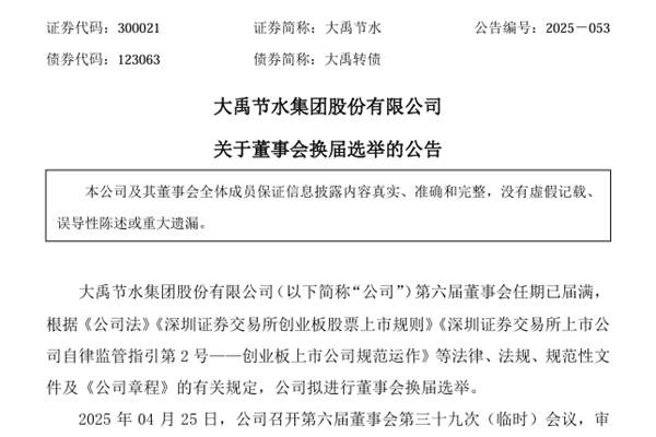 大禹节水集团股份有限公司(简称:大禹节水)近日公告称,公司拟进行董事会换届选举。 公司第七届董事会由9名董事组成,其中非独立董事6名(含职工代表董事1名),独立董事3名。经公司第六届董事会提名,董事会提名委员会审查及第六届董事会审议,公司董事会同意提名王浩宇先生、王冲先生、谢永生先生、颜立群先生、吴文勇先生为第七届董事会非独立董事候...