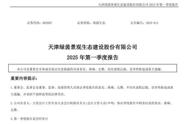 天津绿茵景观生态建设股份有限公司(简称:绿茵生态)近日发布《2025年第一季度报告》。报告期内,绿茵生态实现营业收入为8752.58万元,同比增长1.21%;归母净利润为2671.13万元,同比下降28.44%;扣非归母净利润为2449.85万元,同比下降32.69%;基本每股收益0.09元。图源:绿茵生态公告 申明:本站发布此信息...