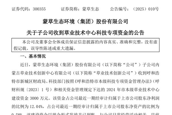 近日,蒙草生态环境(集团)股份有限公司(简称:蒙草生态)发布公告,其子公司内蒙古草业技术创新中心有限公司收到呼和浩特市新城区财政局、科技部门拨付的2024年市本级草业技术创新中心建设资金3000万元,占公司最近一期经审计归母净利润的12.04%。该资金将重点支持草业技术研发及创新体系建设。 此次专项资金将用于草生物育种与良种繁育、饲...
