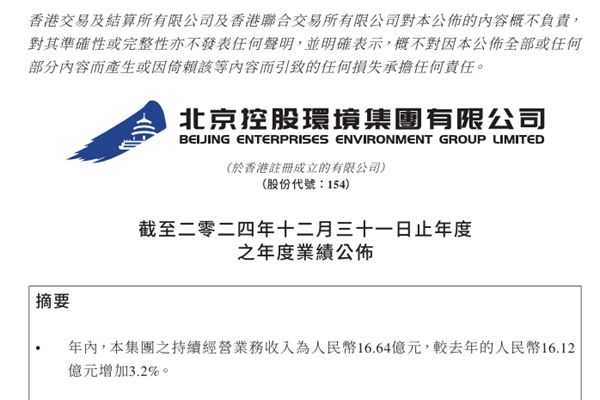 近日,港股上市公司北京控股环境集团公布截至二零二四年十二月三十一日止年度之年度业绩。报告期内,北京控股环境集团持续经营业务收入为人民币16.64亿元,较去年的人民币16.12亿元增加3.2%。年内,息税折旧摊销前溢利为人民币7.10亿元,较去年的人民币6.62亿元增加7.3%。公司股东应占年内溢利为人民币2.86亿元,较去年的人民币1...