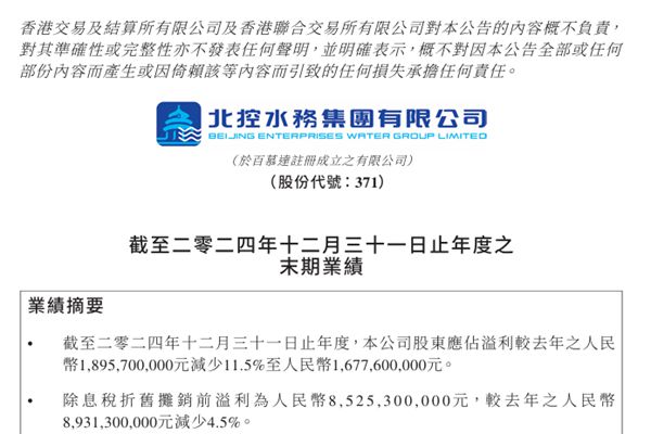3月26日,北控水务集团有限公司(简称:北控水务集团)发布截至2024年12月31日止年度之末期业绩。业绩摘要显示,公司股东应占溢利较上年减少11.5%,降至16.78亿元。营业收入为242.7亿元,较上年减少,主要由于水务项目建造服务的营业收入贡献减少。年内每股基本及摊薄盈利分别为15.63分及15.63分。图源:北控水务集团公告 ...