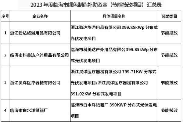根据临海市人民政府印发的《关于推进制造强市建设的若干意见》(临政发〔2022〕24号)的文件精神,2023年度临海市绿色制造(节能技改)项目补助资金,经企业自主申报、镇(街道)初审、会计师事务所和节能量审核第三方机构专项审计、市经信局和市财政局联合审查后,初步确定浙江勤达旅游用品有限公司等41家企业符合本次奖励文件第26条要求,现将名...