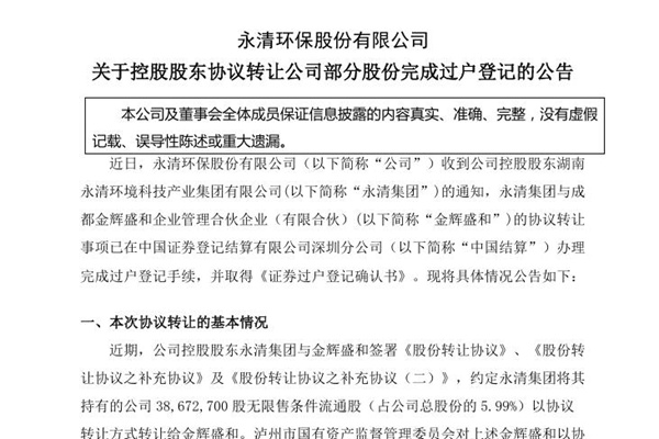 2025年03月13日,永清环保股份有限公司发布《关于控股股东协议转让公司部分股份完成过户登记的公告》。图源:永清环保公告 控股股东湖南永清环境科技产业集团有限公司与成都金辉盛和企业管理合伙企业(有限合伙)的协议转让事项已在中国证券登记结算有限公司深圳分公司办理完成过户登记手续,并取得《证券过户登记确认书》。 合计过户数量38,6...