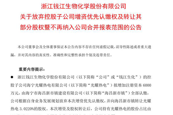 2025年03月14日,浙江钱江生物化学股份有限公司发布《关于放弃控股子公司增资优先认缴权及转让其部分股权暨不再纳入公司合并报表范围的公告》。图源:钱江生化公告 钱江生化控股子公司海宁光耀热电有限公司(以下简称“光耀热电”)拟增加注册资本6000万元,由海宁市海昌新市镇建设有限公司(以下简称“海昌...