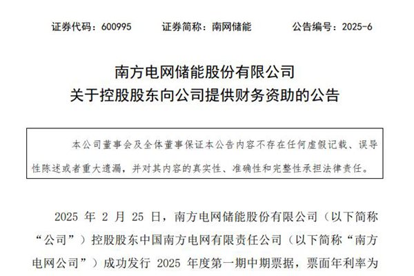 南方电网储能股份有限公司(简称:南网储能)公告称,为支持公司的生产经营与发展,2月25日,控股股东中国南方电网有限责任公司(下称“南方电网”)以借款形式向公司提供 10 亿元人民币的财务资助,借款期限为 1820 日。公司每年按照 2025 年度第一期中期票据的票面利率1.92%向南方电网公司支付利息,到期后一...