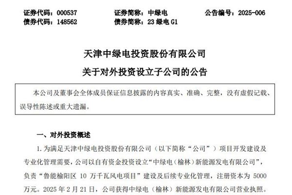 天津中绿电投资股份有限公司(简称:中绿电)近日公告称,公司以自有资金投资设立了“中绿电(榆林)新能源发电有限公司”,负责“鲁能榆阳区 10 万千瓦风电项目”建设及后续专业化管理,注册资本为 5000万元。2025 年 2 月 21 日,中绿电已获得中绿电(榆林)新能源发电有限公司营业执照...