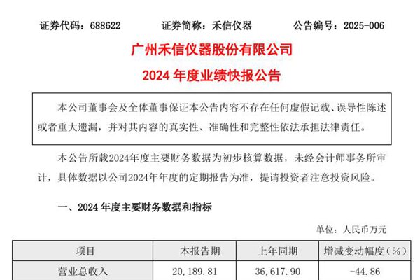 广州禾信仪器股份有限公司(简称:禾信仪器)近日发布《2024年度业绩快报公告》。快报显示,禾信仪器2024年实现营业总收入2.02亿元,同比下降44.86%;归属于母公司股东的净利润-4860.75万元,较去年同期亏损减少4749.86万元;基本每股收益为-0.69元;归属于母公司股东的每股净资产为5.42元。 禾信仪器...