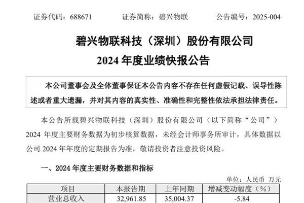 碧兴物联科技(深圳)股份有限公司(简称:碧兴物联)近日发布《2024 年度业绩快报公告》。快报显示,碧兴物联2024年实现营业总收入3.3亿元,同比下降5.84%;归属于母公司股东的净利润-3665.29万元,上年同期净利润为2337.2万元;基本每股收益为-0.46元;归属于母公司股东的每股净资产为14.04元。 碧兴物联专注于物...