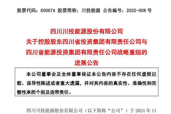 四川川投能源股份有限公司(简称:川投能源)公告称,公司控股股东将由四川省投资集团有限责任公司(以下称“川投集团”)变更为四川能源发展集团有限责任公司(下称“四川能源发展集团”),实际控制人仍为四川省政府国有资产监督管理委员会。 2月27日,川投能源收到川投集团通知,获悉四川能源发展集团...