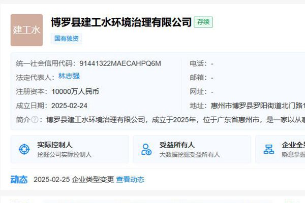 2月24日,博罗县建工水环境治理有限公司正式成立,注册资本10000万人民币,经营范围: 【一般项目】雨水、微咸水及矿井水的收集处理及利用;生态恢复及生态保护服务;水环境污染防治服务;市政设施管理;土壤污染治理与修复服务;大气环境污染防治服务;地质灾害治理服务;环境保护专用设备销售;防洪除涝设施管理;土地整治服务;农业面源和重金属污...