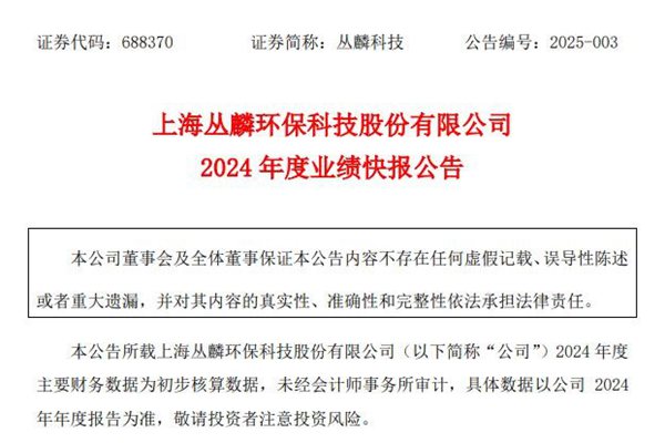 上海丛麟环保科技股份有限公司(简称:丛麟科技)近日发布《2024 年度业绩快报公告》。公告显示,丛麟科技实现营业总收入5.95亿元,较上年同期减少6.22%。尽管营业收入有所下降,归母净利润为9309万元,较上年同期增长5.35%,主要得益于在成本控制和运营效率方面的提升。 丛麟科技表示,报告期内,公司面临着营业收入下降的挑战,通过...
