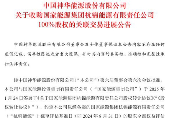 2025年02月13日,中国神华能源股份有限公司发布《关于收购国家能源集团杭锦能源有限责任公司100%股权的关联交易进展公告》。图源:中国神华公告 公告表示,中国神华与国家能源投资集团有限责任公司于2025年1月24日签署了《关于国家能源集团杭锦能源有限责任公司股权转让协议》,约定本公司以经备案的国家能源集团杭锦能源有限责任公司截至...