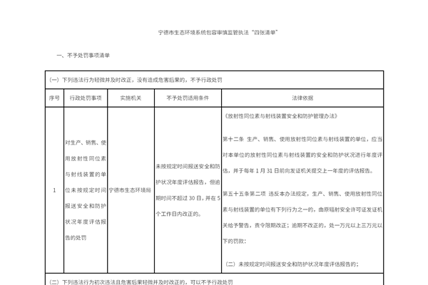 宁德市生态环境局关于印发宁德市生态环境系统包容审慎监管执法“四张清单”的通知 宁市环规〔2025〕1号 各县级生态环境局、东侨经济技术开发区生态环境局,机关各科室、直属单位: 为贯彻落实《行政处罚法》《优化营商环境条例》《福建省行政执法条例》等法律法规,进一步健全我市生态环境系统行政处罚裁量体系,加强包容审慎监...