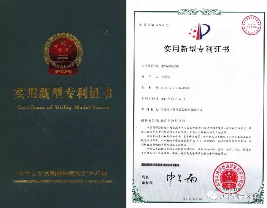 冠宇牌AOP水体净化设备并于2017年2月份取得专利。